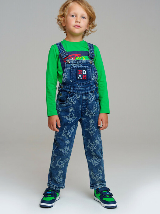 Джинсовый детский комбинезон comfort fit (свободная посадка) для мальчика. Модный джинсовый комбинезон на кнопках утепленный флисом. Внутренняя утяжка.  Модель из капсульной коллекции DINO CLUB (ДИНО КЛАБ). Соберите полный образ в едином стиле! Комбинезон будет актуален для детского сада, в садик.