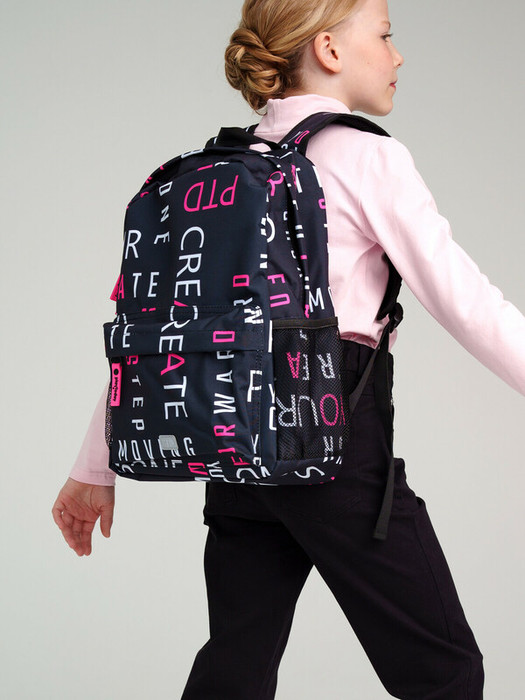 Школьный рюкзак  для девочки подростка. Широкие регулируемые лямки с мягкими вкладками и сетчатым покрытием. Основной отдел на молнии, карман на молнии, 2 боковых сетчатых кармана. Внутри рюкзака: отдел для папок, карман на молнии, 2 кармана без замка, карабин для крепления пенала/ключей. Усиленная спинка и дно. Светоотражающие элементы на переднем кармане и плечевых ремнях.