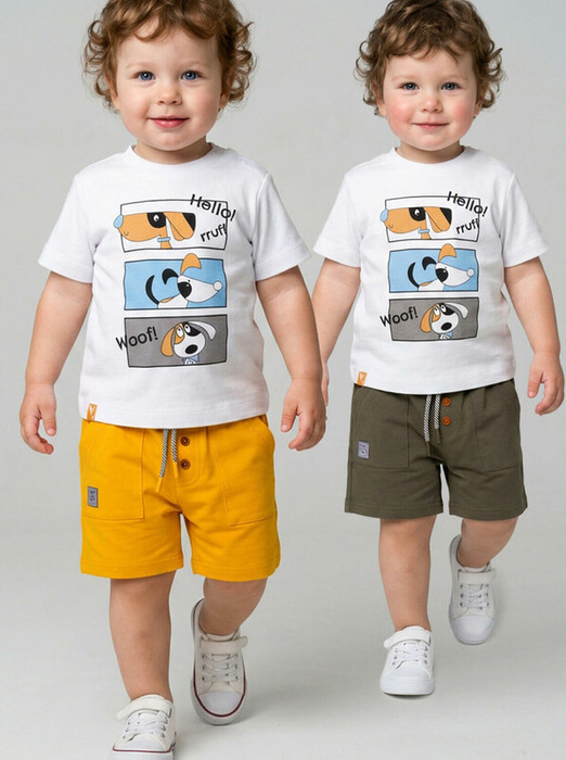 Набор детских шорт для мальчика. В комплект входят две пары шорт свободного кроя, длиной выше колена. Модели из мягкого, хлопкового трикотажа джерси. Удобная посадка обеспечивается эластичным поясом со шнуром. По бокам расположены два кармана.