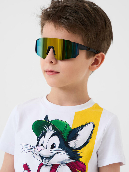 Солнцезащитные очки футуристической формы в стиле Y3K для мальчика подростка. Гибкая пластиковая конструкция мягко облегает лицо, не сдавливая его,и обеспечивают плотную посадку даже во время самых активных занятий ребенка. Солнцезащитные очки с фильтром Cat3.  Темные оранжевые линзы имеют защиту UV400, которая отражает 100% ультрафиолетовых лучей с длиной волны менее 400 нанометров, эффективно блокируя все ультрафиолетовые лучи при солнечном свете. Небьющиеся линзы из акрила. Ширина оправы - 125 мм, длина дужки - 113 мм. Обхват головы 50-52 см. Такие очки эффективны для защиты глаз в тропиках, у моря и в горах. Очки транспортируются в картонной коробке. В комплект входит фирменный текстильный чехол из микрофибры, с помощью которого легко ухаживать за изделием. Очки транспортируются в картонной коробке.