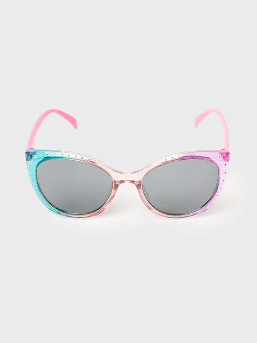 Солнцезащитные очки для девочки. Градиентная прозрачная оправа по верхнему краю декорирована стразами. Солнцезащитные очки с фильтром Cat3 и поляризацией.  Тёмные линзы имеют защиту UV400, которая отражает 100% ультрафиолетовых лучей с длиной волны менее 400 нанометров, эффективно блокируя все ультрафиолетовые лучи при солнечном свете. Ширина оправы - 126 мм, длина дужек - 125 мм. Обхват головы 48-50 см. Небьющиеся линзы из триацетата целлюлозы устойчивы к царапинам. Поляризационные фильтры на очках поглощают блики, отражаемые от горизонтальных поверхностей, что помогает повысить четкость зрения и избежать напряжения глаз ребенка. Только при просмотре в линзах с поляризацией видны воздушные шарики в виде сердечек на тест-картинке, вложенной в чехол.  Небьющиеся линзы из триацетата целлюлозы устойчивы к царапинам. Такие очки эффективны для защиты глаз в тропиках, у моря и в горах. В комплекте: текстильный чехол, тест-картинка со слониками. Текстильный чехол выполнен из микрофибры и им можно легко ухаживать за изделием. . Очки транспортируются в картонной коробке.