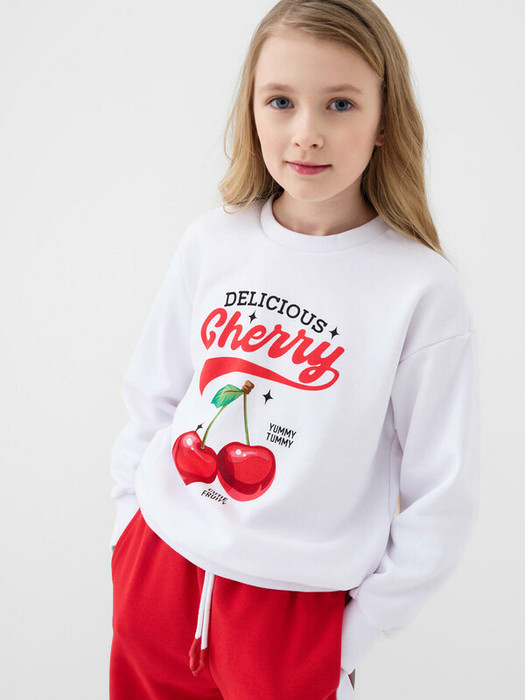 Свитшот оверсайз для девочки подростка. Выполнен из хлопкового футера без начеса. На передней части — выразительный принт с вишнями. Горловина, манжеты и низ изделия оформлены эластичными резинками.
