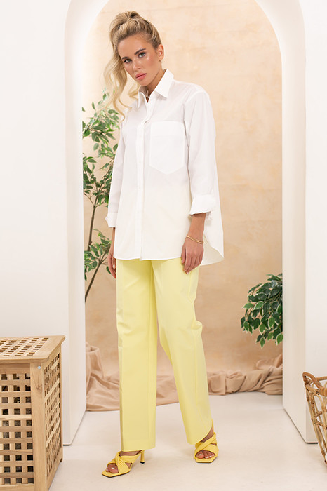 Брюки прямого силуэта из плотной костюмной ткани. На передней части брюк выполнена имитация гульфика, на задней-накладные карманы. Пояс с эластичной резиной.
