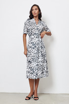 Платье из эластичного полотна с жаккардовым анималистичным узором. Изделие прилегающего силуэта с длинным втачным рукавом. Воротник-стойка. По среднему шву спинки застежка-молния.