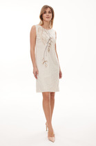Платье приталенного силуэта из вискозной плательной ткани. Изделие отрезное по линии талии с защипами. В боковых швах карманы. Втачной короткий рукав. Притачная планка с застёжкой на пуговицы. Вырез горловины обработан отложным воротником на стойке. В комплекте пояс из основной ткани.