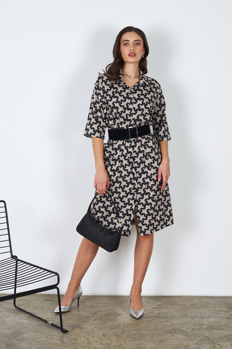 Платье-рубашка свободного силуэта, с застёжкой на пуговицы из вискозной ткани. Короткий втачной рукав в спущенную пройму. Вырез горловины обработан отложным воротником на стойке. На передней части изделия выполнены накладные карманы. В комплекте пояс из основной ткани.