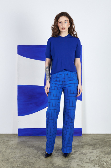 Брюки прямого силуэта из костюмной ткани. Пояс притачной с эластичной резиной.