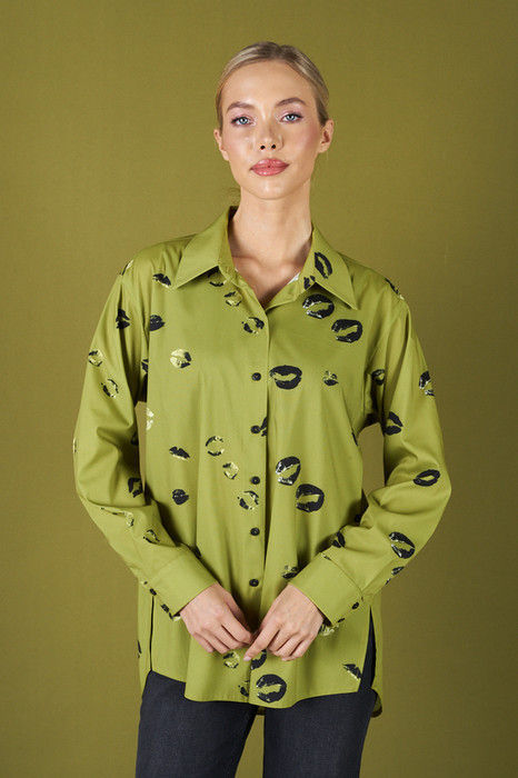 Рубашка свободного силуэта из вискозной ткани с застёжкой на пуговицы. Низ изделия асимметричной длины (спинка удлинена относительно переда) с закруглениями по бокам и разрезами. Рубашечный рукав на манжете с застёжкой на пуговицы. Вырез горловины обработан отложным воротником на стойке. На задней части изделия выполнена кокетка с небольшой складкой. Достоинство этой модели в способности скрыть некоторые недостатки фигуры. Её можно сочетать как с брюками, так и с джинсами.