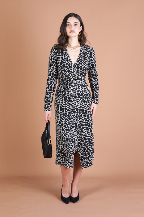 Платье прямого силуэта из эластичного полотна с жаккардовым анималистичным узором. Глубокий V-образный вырез горловины плавно переходит в запах, фиксируется притачным поясом. Втачной длинный рукав.