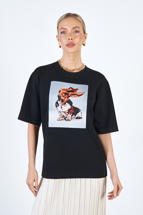 Джемпер свободного силуэта из эластичного полотна. Короткий втачной рукав в спущенную пройму. Вырез горловины оформлен бейкой. На передней части изделия выполнена аппликация.
