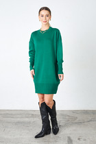 Платье свободного силуэта. Рукав втачной в спущенную пройму. Вырез горловины оформлен резинкой. Низ изделия и низ рукава оформлены высокой резинкой. Изделие выполнено из меланжевой структурированной пряжи.