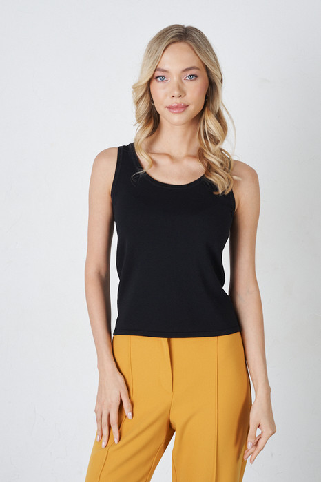 Топ на лямках прилегающего силуэта. Линия горловины и линия проймы оформлены резинкой. Изделие выполнено из мягкой вискозной пряжи.