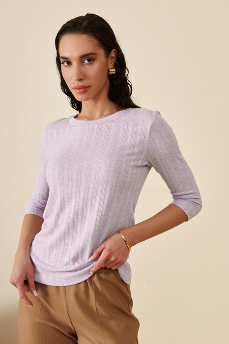 Джемпер прилегающего силуэта из фактурного эластичного полотна. Втачной рукав 3/4. Круглый вырез горловины оформлен бейкой.