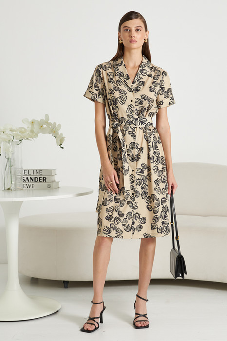 Платье из вискозной плательной ткани прямого силуэта с застёжкой на пуговицы. Втачной короткий рукав с отворотом. Вырез горловины оформлен английским воротником, который визуально сделает фигуру стройнее и подчеркнет красивую линию груди. В комплекте пояс из основной ткани.