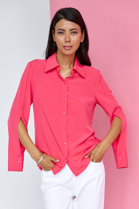 Блуза-рубашка из блузочной ткани. Свободный силуэт с застёжкой на пуговицы. Вырез горловины обработан отложным воротником на стойке. Оригинальный втачной рукав на манжете с застёжкой на пуговицы.