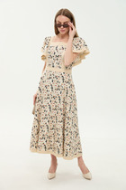 Платье свободного силуэта из плательной ткани. По центру передней части изделия выполнен шов. Цельнокроеная стойка, переходящая в V-образный вырез горловины, визуально делает фигуру стройнее. Втачной короткий рукав.