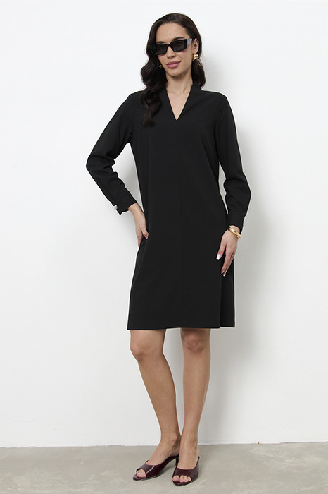 Платье свободного силуэта из плательной ткани. По центру передней части изделия выполнен шов. Цельнокроеная стойка, переходящая в V-образный вырез горловины, визуально делает фигуру стройнее. Втачной длинный рукав. Низ рукава на манжете с застёжкой на пуговицы-жемчужины.