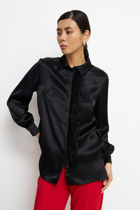 Блуза из вискозной ткани с сатиновым блеском. Свободный силуэт с разрезами в боковых швах и застёжкой на пуговицы. На задней части изделия выполнена кокетка с небольшой складкой. Вырез горловины обработан отложным воротником на стойке. Втачной рукав на манжете с застёжкой на пуговицы. Изделие украшено съемной планкой с перьями. Перед стиркой планку с перьями необходимо снять.