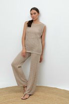 Брюки из костюмной ткани, чуть зауженные книзу. Свободный силуэт с завышенной талией. На передней половинке по линии талии застрочены складки. На задней половинке - талиевые вытачки. Застёжка на молнию-гульфик и пуговицы. В боковых швах декоративные вставки в авангардном стиле.