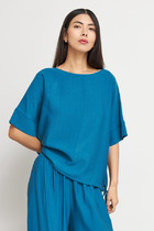 Блуза из вискозной ткани с сатиновым блеском. Свободный силуэт с разрезами в боковых швах и застёжкой на пуговицы. На задней части изделия выполнена кокетка с небольшой складкой. Вырез горловины обработан отложным воротником на стойке. Втачной рукав на манжете с застёжкой на пуговицы. Изделие украшено съемной планкой с перьями. Перед стиркой планку с перьями необходимо снять.