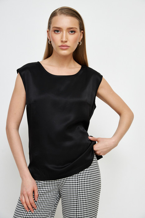 Топ из вискозной ткани с сатиновым блеском. Свободный силуэт, с небольшими разрезами в боковых швах. Круглый вырез горловины и линии проймы окантованы косыми бейками из основной ткани.