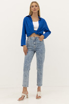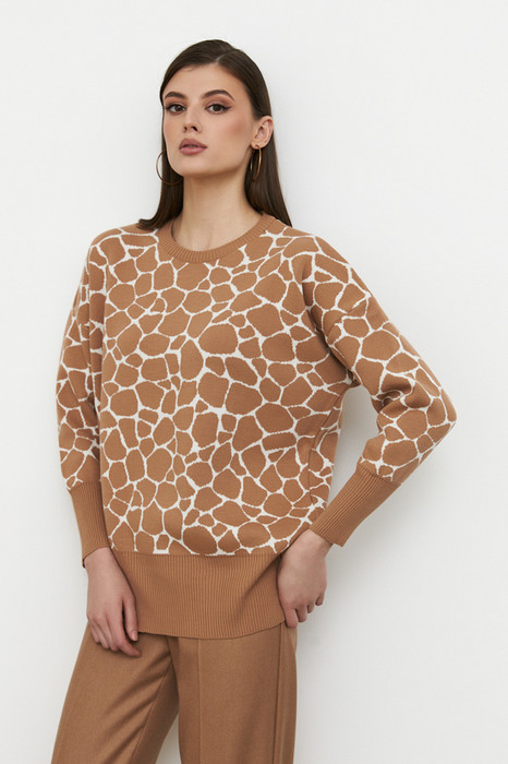 Джемпер свободного силуэта со спущенной линией плеча и длинным рукавом. Круглый вырез горловины оформлен резинкой, низ изделия и низ рукава-высокой резинкой. Изделие выполнено из мягкой структурированной пряжи.