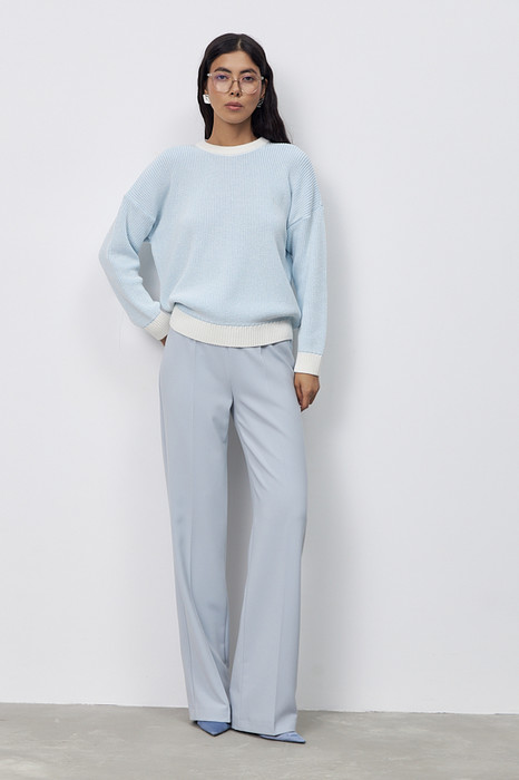 Брюки прямого силуэта из костюмной ткани. Пояс притачной с эластичной резиной.