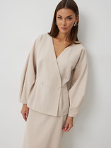 Жакет прямого силуэта с английским воротником из хлопковой ткани. На передней части жакета застежка на пуговицу и накладные карманы. Втачной длинный рукав. Изделие имеет четкую линию плеча благодаря плечевым накладкам.