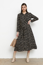 Платье из вискозной ткани с крэш-эффектом свободного силуэта. Изделие отрезное по линии талии с резинкой. Лиф платья с запахом, фиксируется на пуговицу для удобства. На передней части юбки выполнена складка, имитирующая запах, в боковых швах карманы. Линия горловины оформлена воротником-стойкой. Втачной короткий рукав с отворотом. В комплекте пояс из основной ткани.