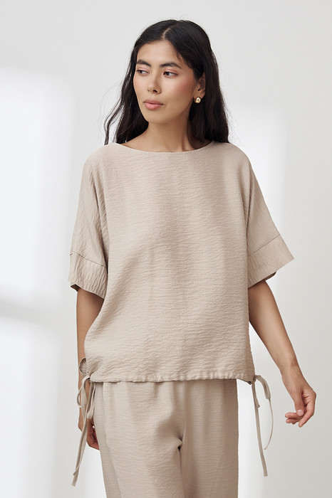 Блуза из вискозной ткани с крэш-эффектом. Очень свободный силуэт с небольшими разрезами по бокам. Круглый вырез горловины. Цельнокроеный рукав с притачной манжетой. Низ изделия затягивается на кулиску.