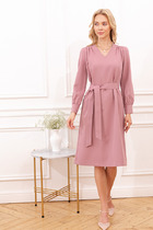 Платье из хлопковой ткани отрезное по линии талии. Изделие прилегающего силуэта в области груди и свободного кроя в области бёдер, с карманами в боковых швах. Линия талии завышена. На полочке нагрудная вытачка переведена в широкий цельнокроеный пояс, завязывающийся сзади. На спинке — талиевые вытачки. Глубокий V-образный вырез горловины. Застёжка на пуговицы в нижней части платья. Рукав втачной, собран по окату и по низу рукава в густую сборку. Низ рукава обработан манжетой.