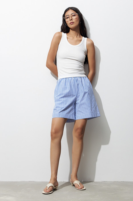 Шорты свободного силуэта из хлопковой ткани. Пояс притачной с эластичной резиной, в боковых швах карманы.