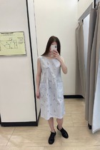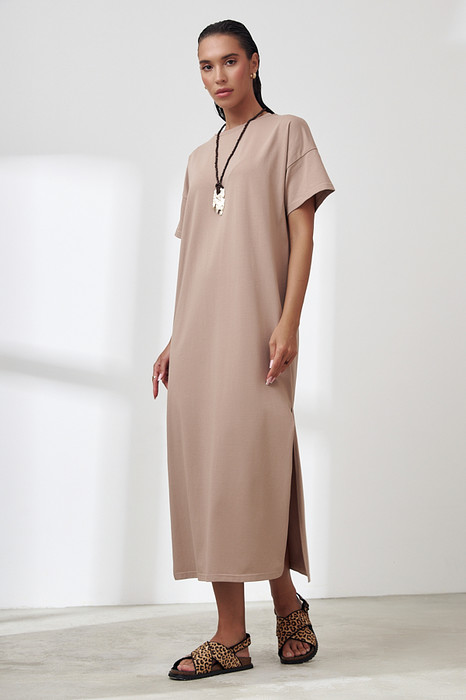 Платье из хлопкового эластичного полотна. Свободный силуэт с разрезами в боковых швах. Короткий втачной рукав в спущенную пройму. Вырез горловины оформлен бейкой.