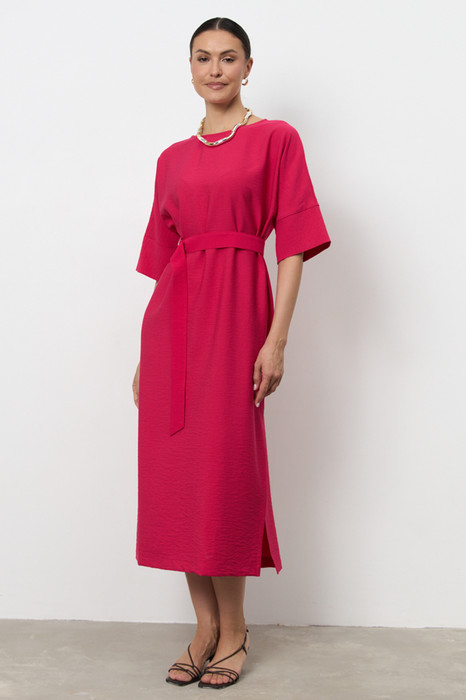 Платье из вискозной ткани с крэш-эффектом. Свободный силуэт, с разрезом в боковом шве. Круглый вырез горловины окантован косой бейкой из основной ткани. Цельнокроеный рукав с притачной манжетой. В комплекте пояс из основной ткани. В таблице размеров представлены параметры человека, а не изделия.