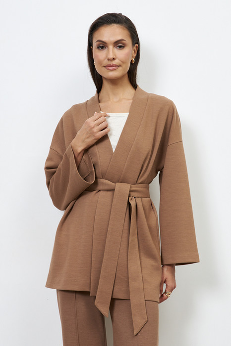 Кардиган из эластичного полотна свободного силуэта с притачной планкой. Втачной широкий рукав в спущенную пройму. В комплекте пояс, позволяющий создавать приталенный силуэт.