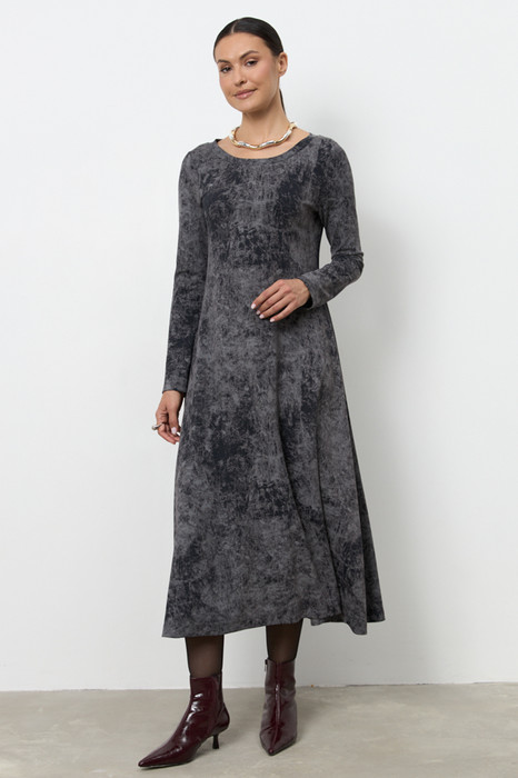 Платье из эластичного полотна полуприлегающего силуэта, расширенное книзу. Втачной длинный рукав. Круглый вырез горловины оформлен притачной бейкой.