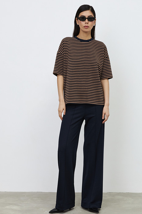 Костюм из эластичного полотна. Джемпер свободного силуэта со спущенной линией плеча и рукавом до локтя. Вырез горловины оформлен бейкой из основной ткани. Брюки прямого силуэта. Пояс притачной с эластичной резиной. На передней части брюк застрочены стрелки.