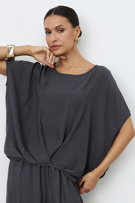 Блуза из вискозной ткани. Свободный крой асимметричной длины (спинка удлинена относительно переда). Спущенное плечо. Линия проймы, линия горловина и низ изделия окантованы косой бейкой из основной ткани. Изюминкой являются оригинальные складки на передней и задней части изделия.