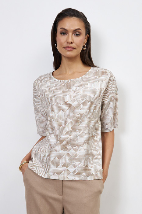 Блуза из вискозной ткани свободного силуэта. Низ изделия асимметричной длины (спинка удлинена относительно переда) с разрезами в боковых швах. Втачной рукав в спущенную пройму. Круглый вырез горловины оформлен косой бейкой из основной ткани.