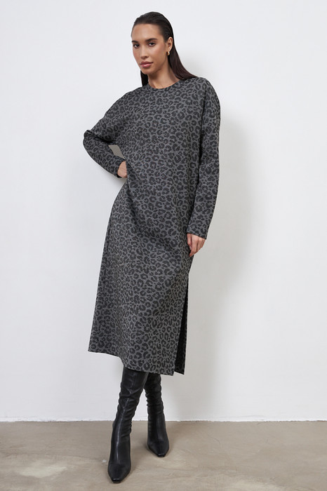 Платье из эластичного полотна свободного силуэта с разрезом в боковом шве. Изделие со спущенной линией плеча и длинным рукавом. Вырез горловины оформлен бейкой из основной ткани. В таблице размеров представлены параметры человека, а не изделия.