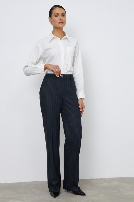 Брюки из костюмной ткани прямого силуэта. Застёжка на молнию-гульфик и пуговицу. В боковых швах выполнены карманы с подкройным бочком. Притачной пояс со шлёвками. На задней половинке брюк карманы в рамку с пуговицей, на поясе вставка с резиной.