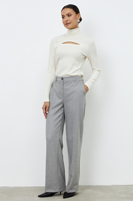 Брюки из костюмной ткани прямого силуэта. На передней половинке изделия выполнены карманы с подкройным бочком, на задней - талиевые вытачки и имитация карманов в рамку. Притачной пояс со шлёвками. Застёжка на молнию-гульфик и пуговицу. Такой крой выгодно подчеркнёт длину ваших ног.