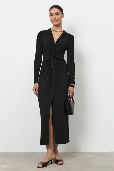 Платье из эластичного полотна прилегающего силуэта. Оригинальный крой с перекрутом на передней части изделия, снизу разрез. Глубокий V-образный вырез горловины. Втачной длинный рукав.