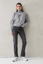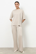 Костюм из эластичного полотна. Джемпер свободного силуэта со спущенной линией плеча и рукавом до локтя. Вырез горловины оформлен бейкой из основной ткани. Брюки прямого силуэта. Пояс с эластичной резиной. На передней части брюк застрочены стрелки.