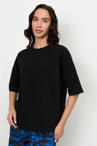 Джемпер из эластичного полотна. Свободный силуэт со спущенной линией плеча и рукавом до локтя. Вырез горловины оформлен бейкой. В таблице размеров представлены параметры человека, а не изделия.