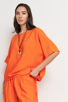 Джемпер свободного силуэта. Низ изделия асимметричной длины (спинка удлинена относительно переда). Длинный рукав-реглан. Круглый вырез горловины, низ изделия и низ рукава оформлены резинкой. Изделие выполнено из мягкой пряжи.