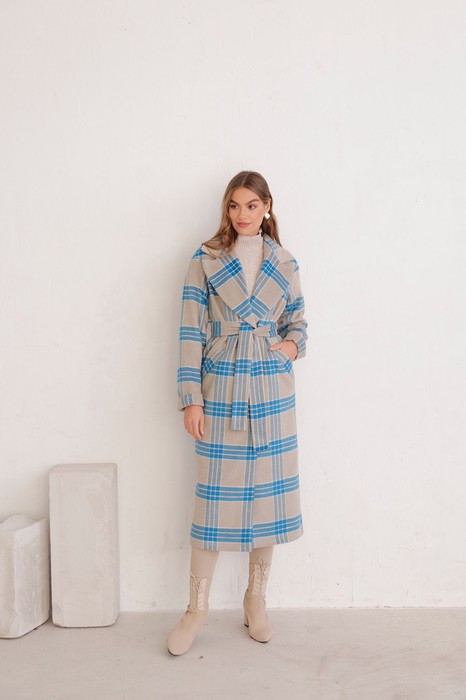 Современное удлиненное пальто прямого кроя с небольшим запахом. Воротник английский с широкими лацканами, плечо спущенное, по низу рукавов отложные манжеты. По среднему шву спинки внизу - шлица. Пальто с карманами, на завязывающемся поясе. Застёжка на металлические пальтовые кнопки.