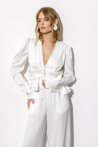 Блуза (рубашка) женская из тканого гладкокрашеного полотна «Лен Манго», свободного покроя, с короткими втачными рукавами, стояче-отложным воротником, центральной бортовой застежкой на обметанные петли и пуговицы. В боковых швах разрезы.