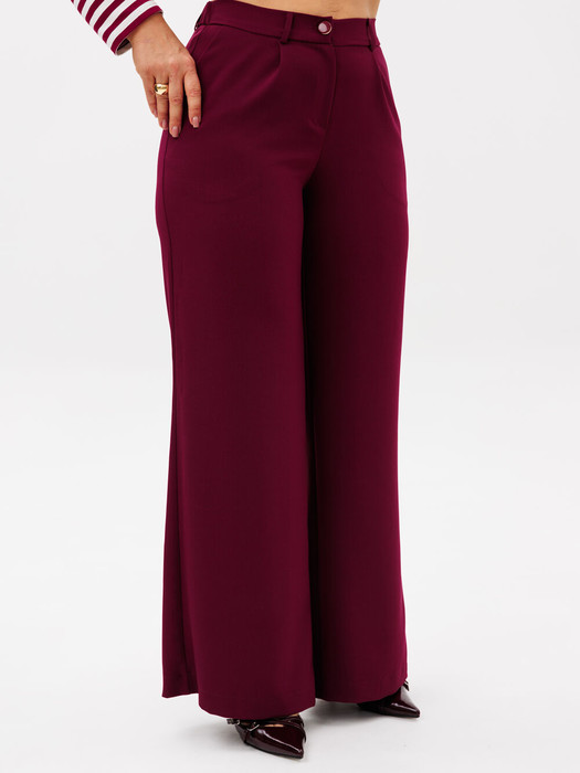 Брюки женские из костюмной ткани для повседневной носки. Силуэт расширяется к низу. На передней части брюк боковые карманы. Брюки с отрезным поясом, застегивающимся на тесьму-молнию и пуговицу. В заднюю часть пояса вставлена резинка, есть шлевки. Хороший вариант для офиса, деловых встреч, прогулок.