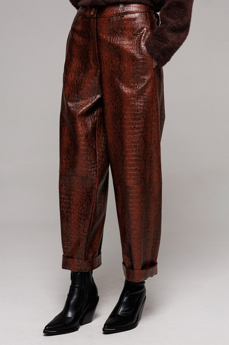 Брюки их эко-кожи немного заужены к низу. На притачном поясе со шлёвками, застежкой-гульфик. Пояс застегивается на петлю-пуговицу. По переду рельефы и карманами в них. По спинке вытачка от пояса. По переду и спинке брюки отрезные по лини колен.